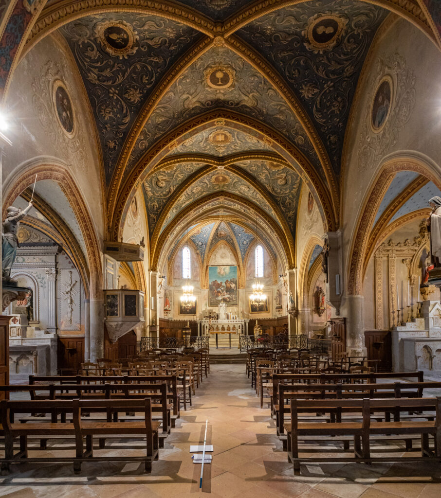 Dès l’entrée, les visiteurs sont frappés par la richesse et la qualité des peintures murales qui ornent les murs et la voûte de la nef. La voûte est entièrement décorée de belles peintures sur un fond bleu intense. Un important décor en trompe-l’œil gris argent est constitué d’éléments floraux, d’animaux et de chimères. En outre, dans la partie médiane de la voûte, divers éléments symbolisant l’ancien et le nouveau testament sont représentés en brun, or et argent.